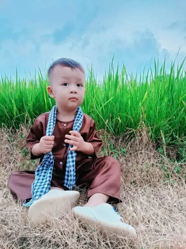 Bà ba bé trai màu nâu có cổ tròn, cúc áo lên sát cổ cùng với cầu vai rộng thể hiện sự nam tính. Kiểu dáng làm nổi bật sự mạnh mẽ giúp trẻ tha hồ hoạt động mà vẫn không mất đi tinh thần của bộ trang phục.