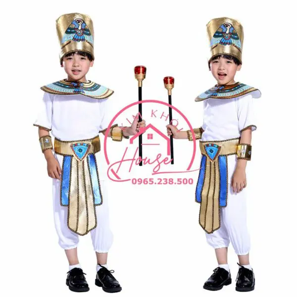 Trang phục Pharaoh Ai Cập Trắng Bé Trai – Trang phục Hy Lạp, La Mã, Ai Cập luôn hướng tới sự hài hoà với đường nét tự nhiên của cơ thể, nhấn mạnh những tư thế hoạt động theo dáng người, độ uyển chuyển khi chuyển động và từ đó phong cách này đã trở thành phong cách cổ điển trong lịch sử thời trang qua những đường nét mềm mại trên trang phục.
